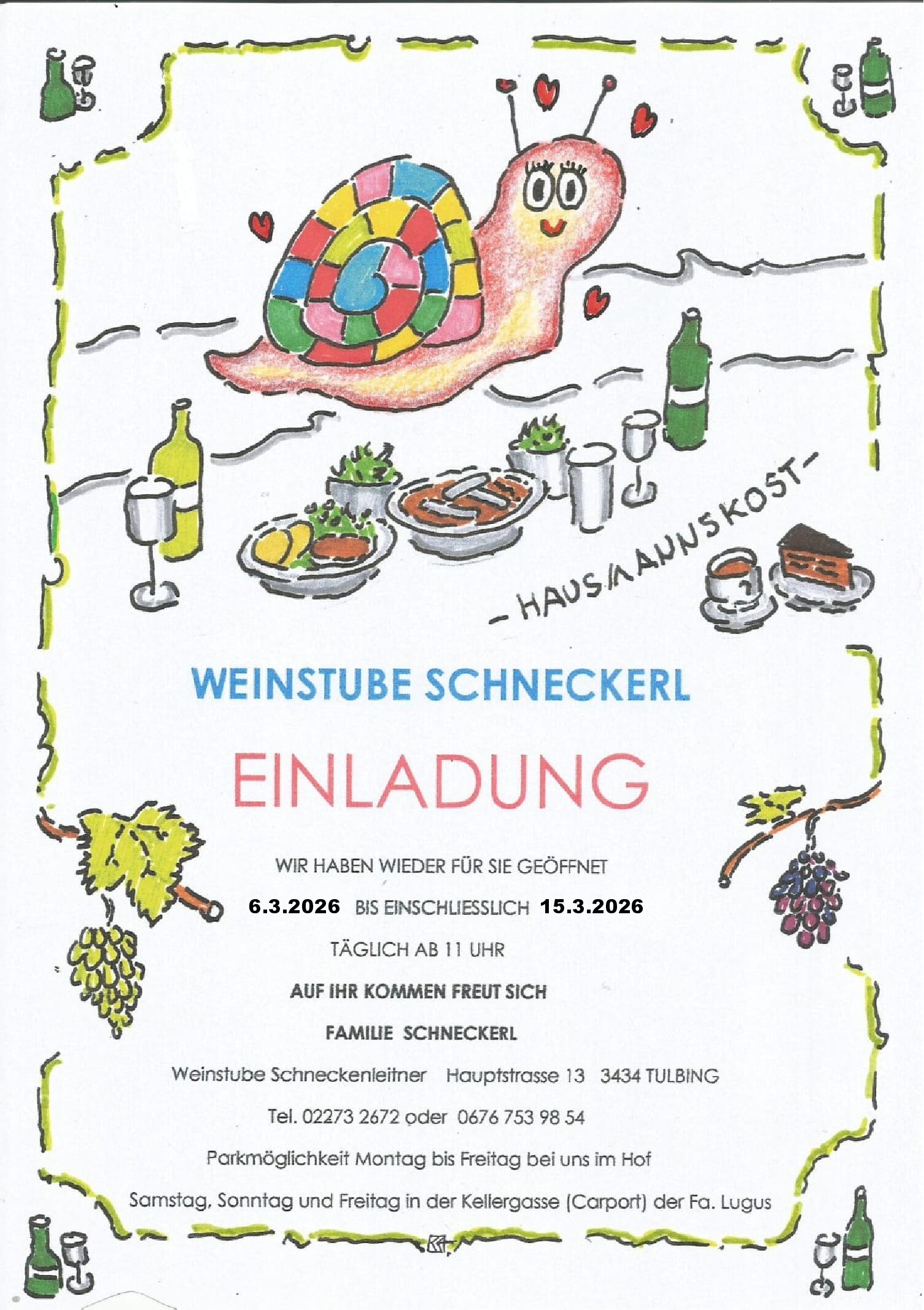 Wir haben wieder von 6.3.26 bis 15.3.26 und von 6.11.26 bis 15.11.26 geöffnet